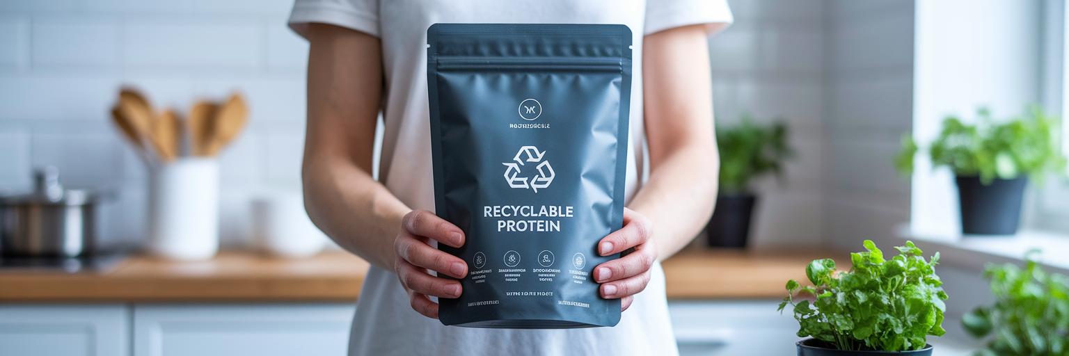 Person holding eco-friendly protein powder pouch.