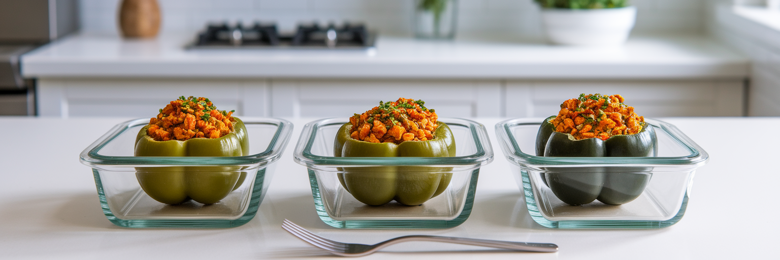 Estos pimientos rellenos también son fantásticos para preparar comidas. Simplemente guárdalos en un recipiente hermético en el refrigerador hasta por cuatro días. Son un almuerzo práctico y nutritivo o una cena rápida entre semana cuando tienes poco tiempo.
