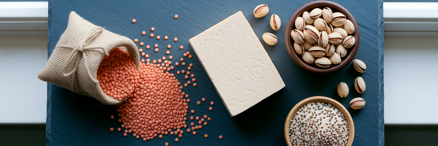 2. Proteína suficiente: Alcanza tu objetivo diario de proteína (1,2-1,6 g/kg) con una variedad de fuentes vegetales.
