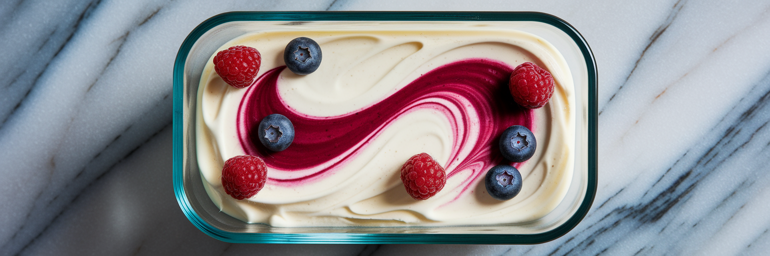 3. Armar y mezclar: Verter la base de vainilla en un molde para pan u otro recipiente apto para congelador. Verter cucharadas de puré de bayas por encima. Usar un cuchillo o una cuchara para mezclar suavemente las bayas con la base. No mezclar demasiado; se busca crear hermosas franjas de color y sabor.