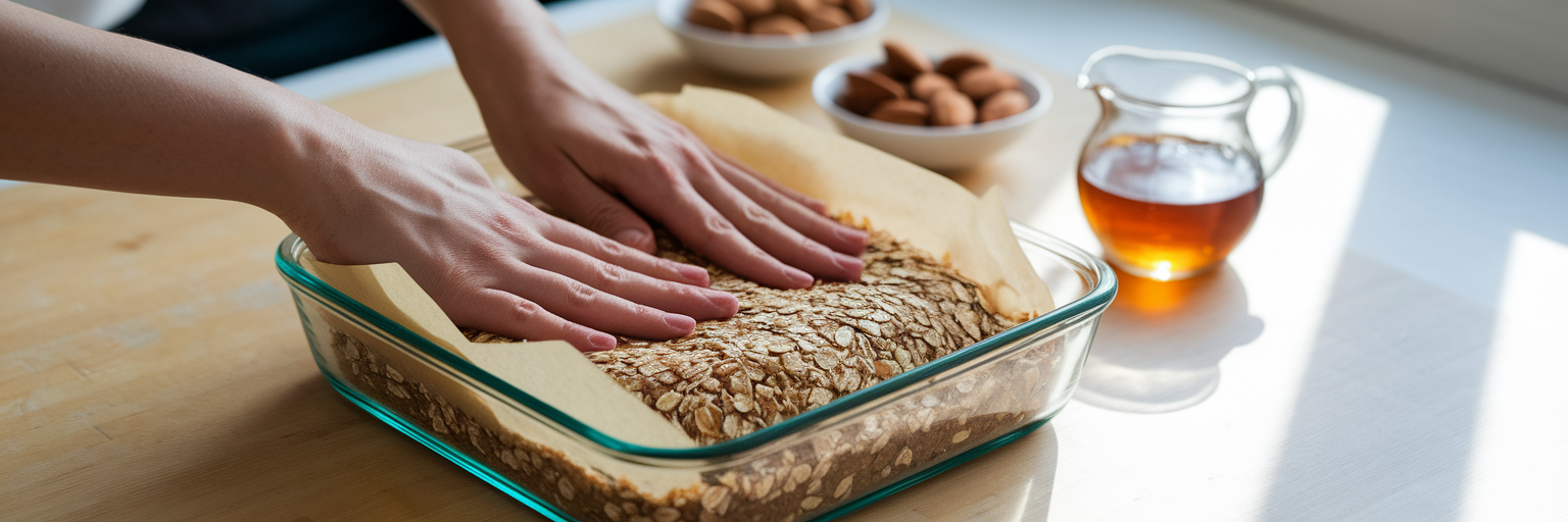 Consejo profesional: Para obtener barras perfectamente densas que no se deshagan, use la base plana de una taza medidora o un vaso para presionar la masa firmemente. Esto elimina las burbujas de aire y garantiza un corte limpio y firme.